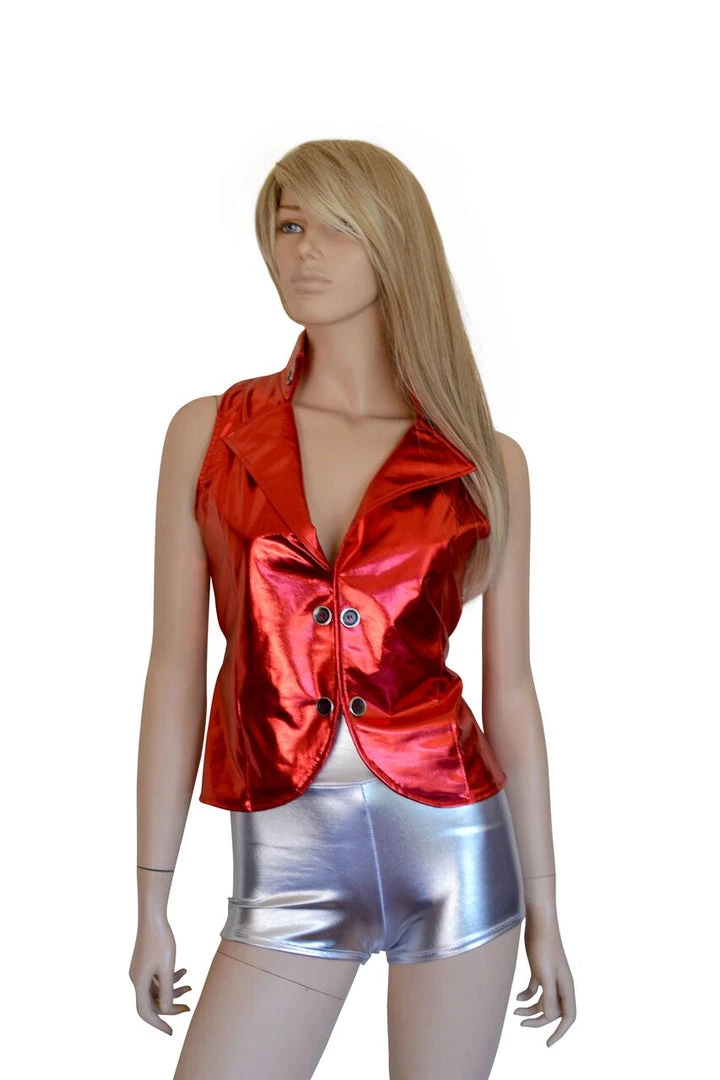 Red vest featuring large collar, hook and eye closure in the front and tie at the waist in the back.