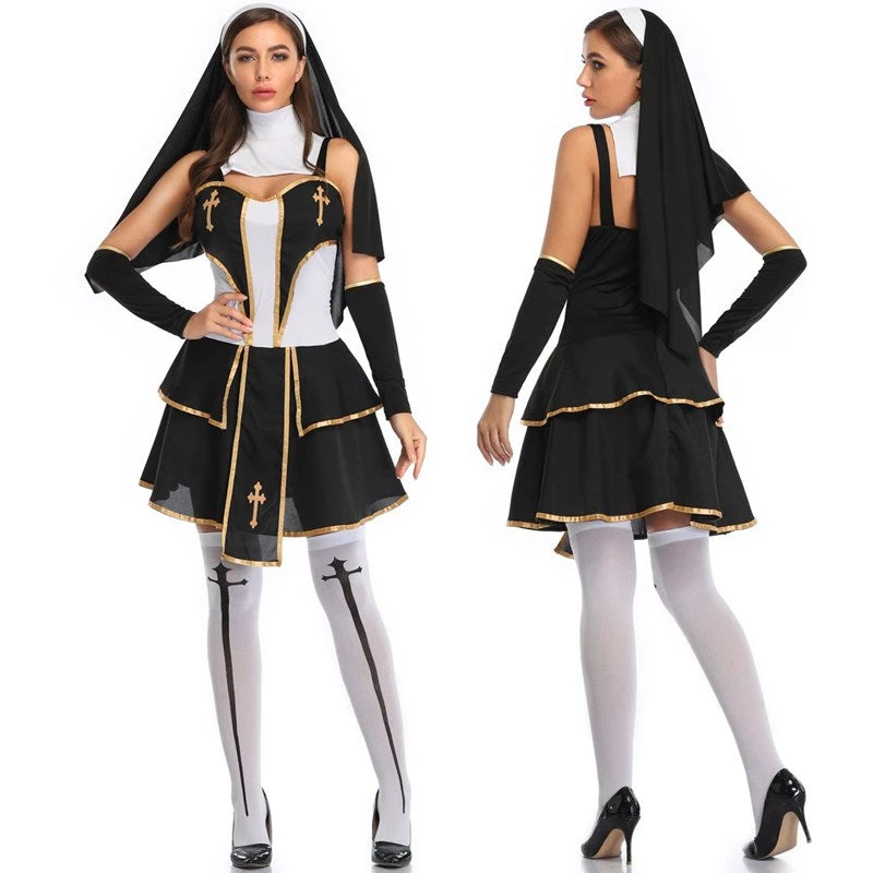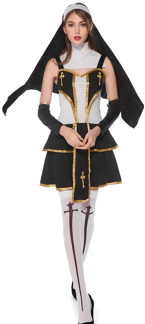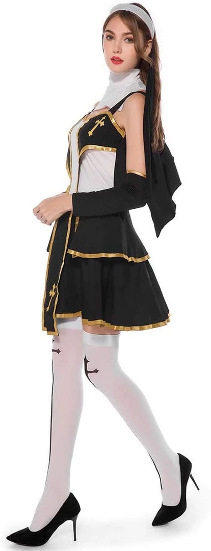 This sexy Priest Costume includes a Black, White and Gold Two-Tiered Dress with Cross Symbols on the Bust and Skirt, a Long Cloth Headpiece and White Stockings with Black Cross Symbols. Shoes not included. L/XL.