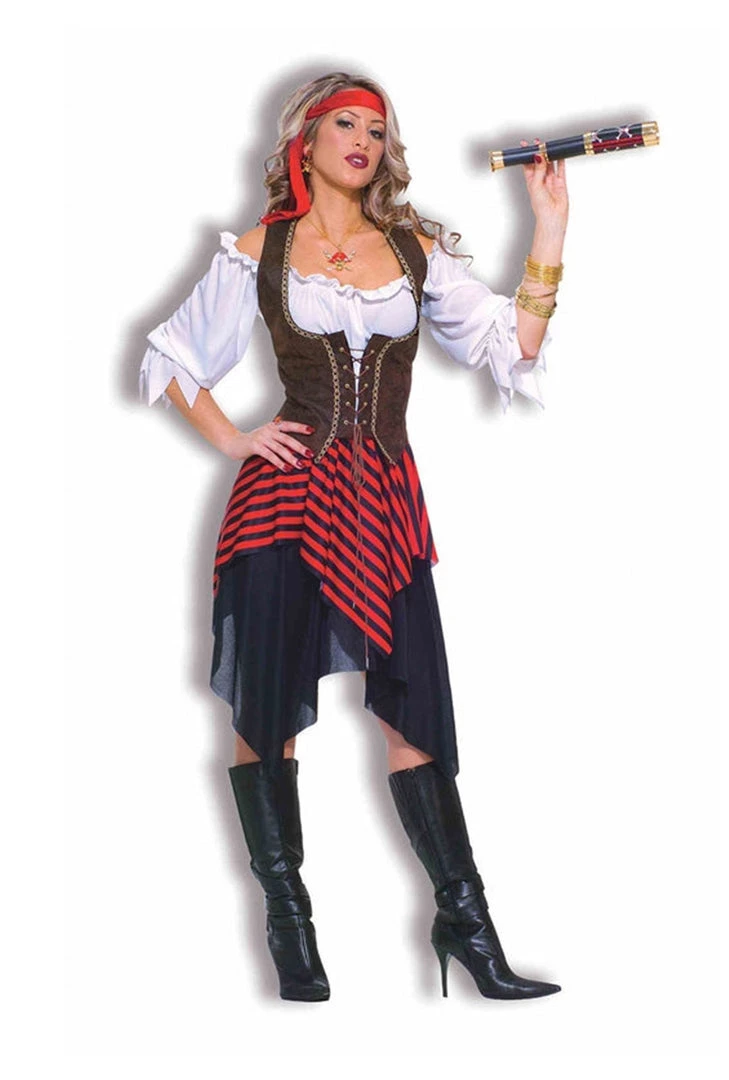 Includes a Black hankerchief skirt with red and black stripe short overlay. The Skirt is elastic waisted, A Brown bodice vest with mottled front material, gold trim detail and gold eyelets with brown cord lace up. A Red velvet look head sash, White blouse features elastic neckline which can be pulled down over the shoulders. Three quarter sleeves with elastic at ends and jaggered hems. Boots and Telescope not included.