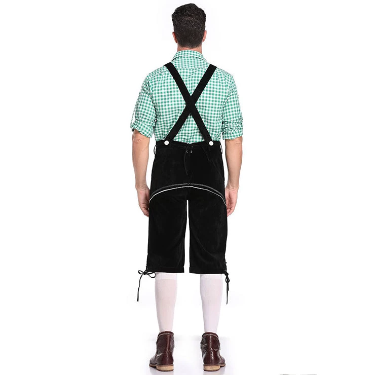 Includes past the knee shorts with attached adjustable suspenders and a 3/4 length sleeved green and white checked button up shirt.