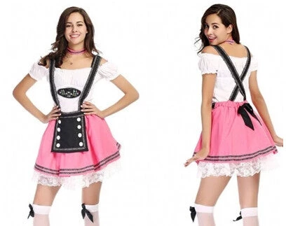 This stunning bright pink Oktoberfest costume includes the skirt with attached apron and suspenders and white tulle underneath and a white puffy sleeved top.