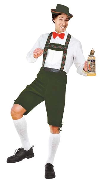 Patterned Oktoberfest classic outfit with green shorts with suspenders and hat. 100% polyester and suits mens waist size up to 34.