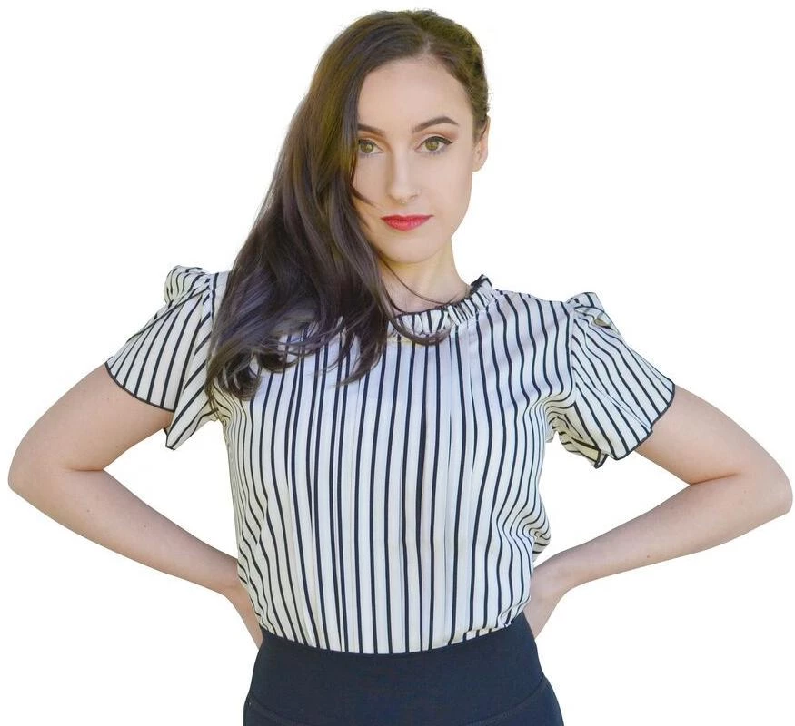 This office appropriate white and black stripped blouse features a high neck line with frill detailing and soft frilled sleeves.