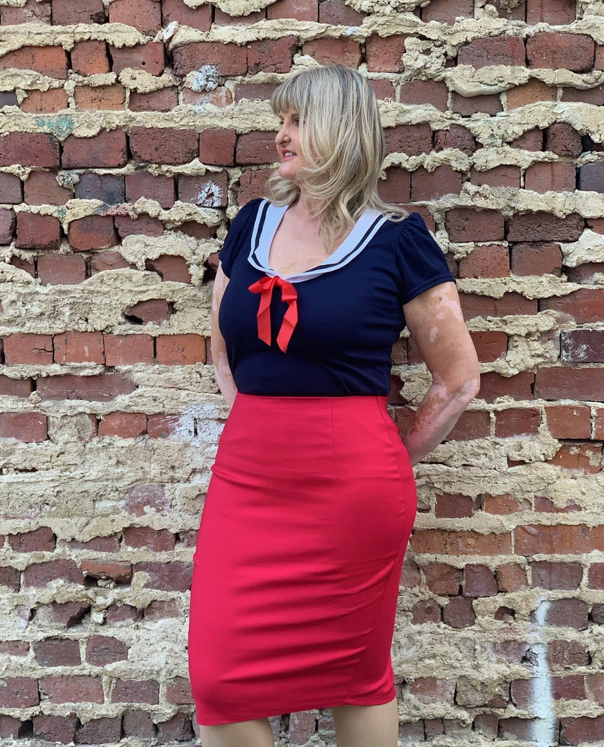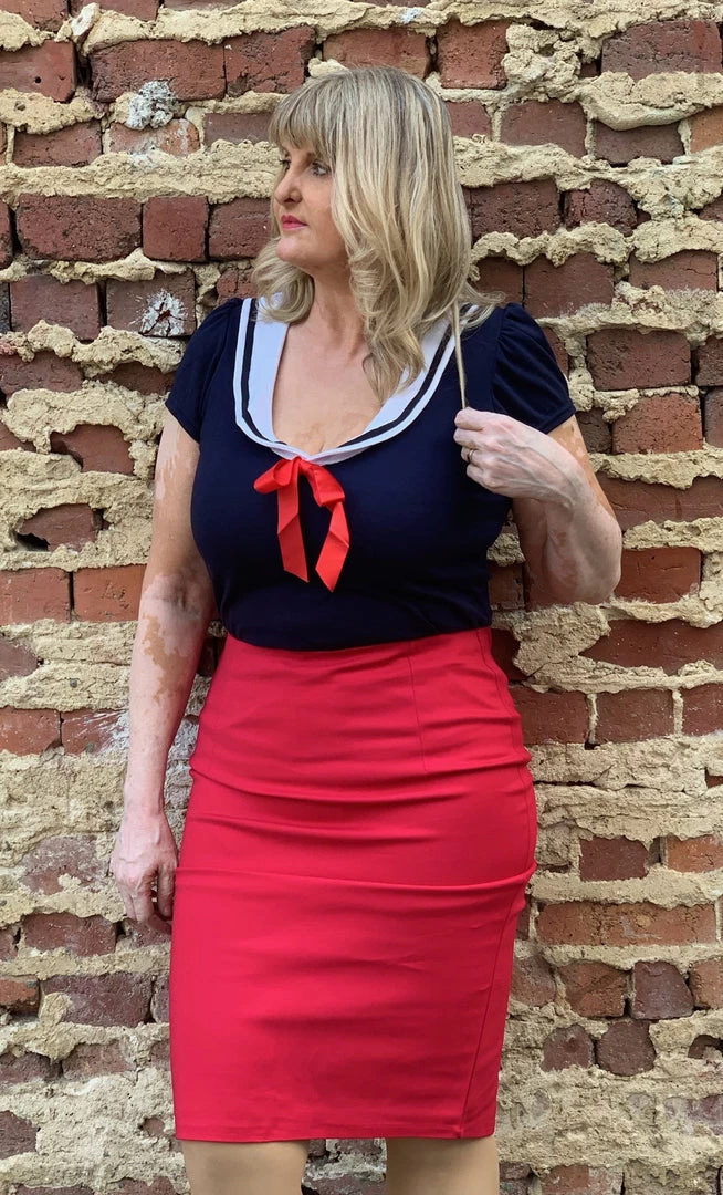 Classic red knee length pwiggle skirt, perfect for dressing up, dressing down or wearing to work! The perfect all rounder that you need in your closet.