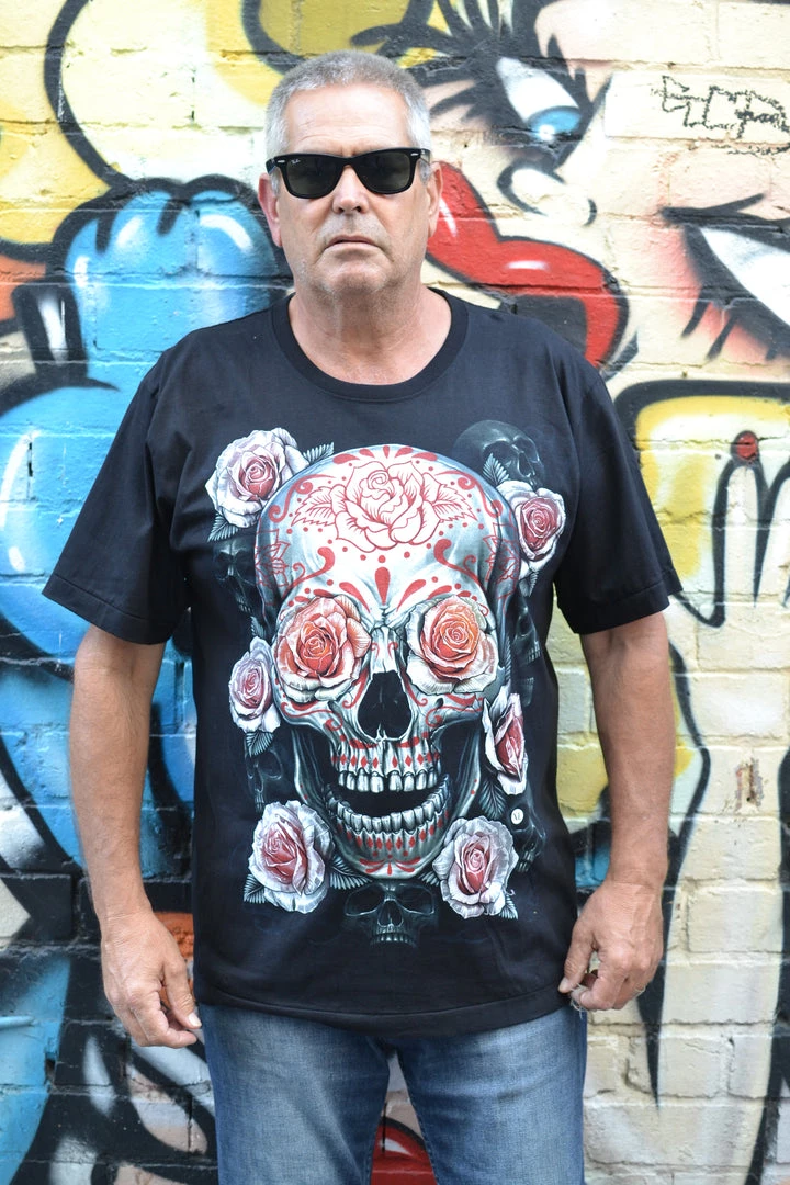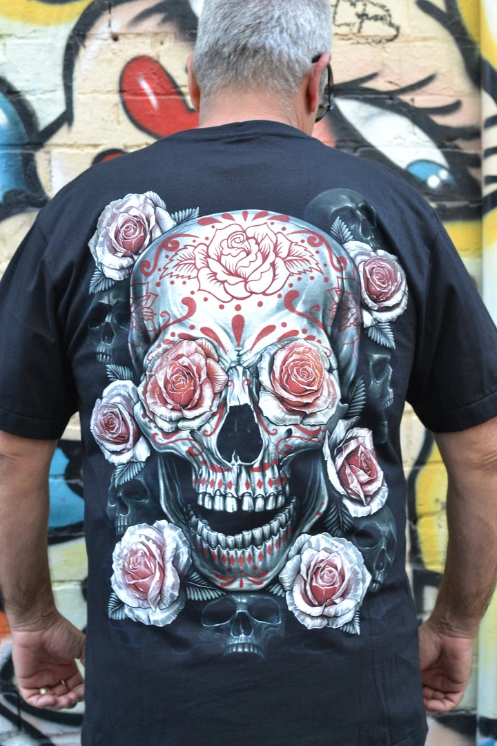 Black short sleeved t-shirt with huge grey and red skull print on the front and back!