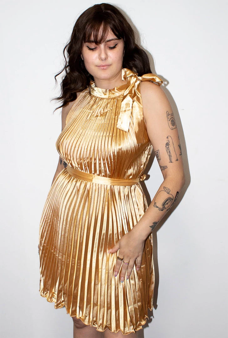 Our 1920s Gold Satin Pleated Dress is a high neck style dress at over-the-knee length with a Tie-Up Waist Belt. Perfect for Flapper/Great Gatsby Costumes!Â