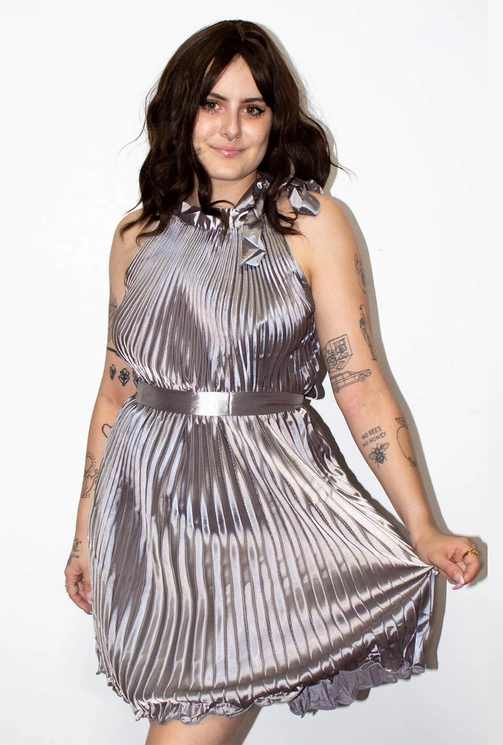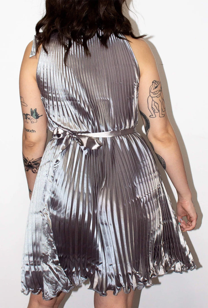 Our 1920s Grey Satin Pleated Dress is a high neck style dress at over-the-knee length with a Tie-Up Waist Belt. Perfect for Flapper/Great Gatsby Costumes!Â