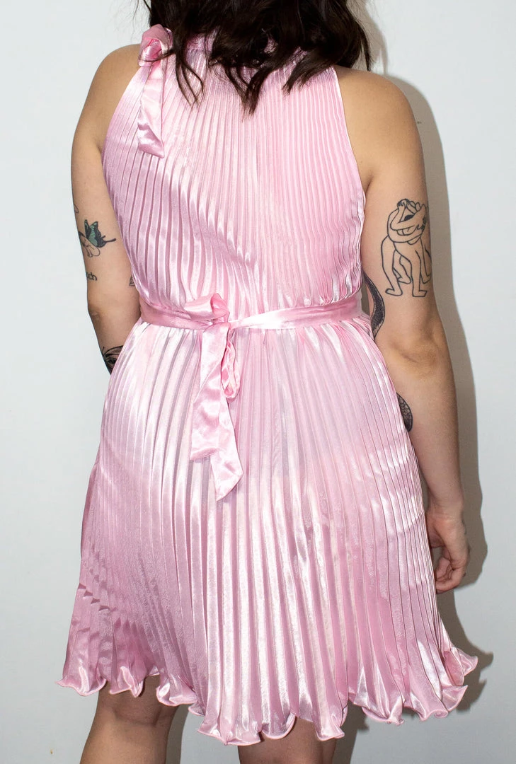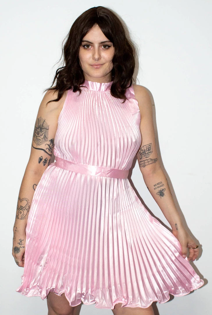 Our 1920s Baby Pink Satin Pleated Dress is a high neck style dress at over-the-knee length with a Tie-Up Waist Belt. Perfect for Flapper/Great Gatsby Costumes!Â