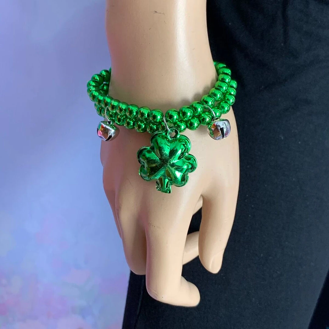 2 green beaded braclets with silver bell and green 3D shamrock detailing.