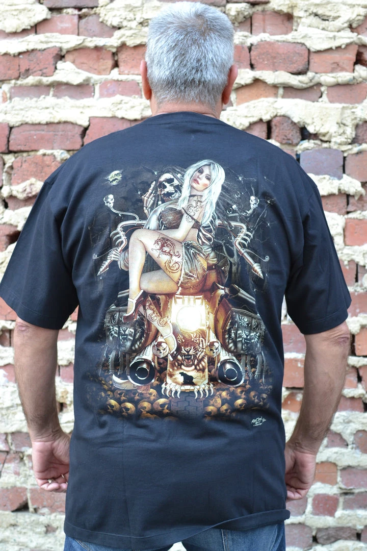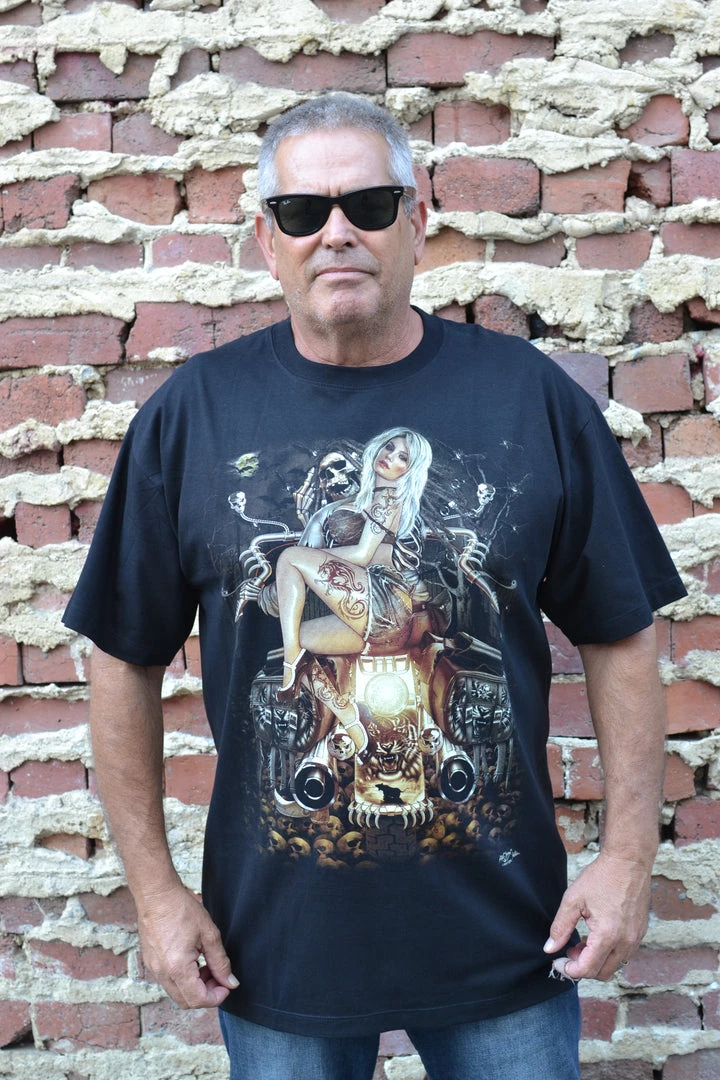 Short sleeved black t-shirt with bold reaper and girl print on the front and back!