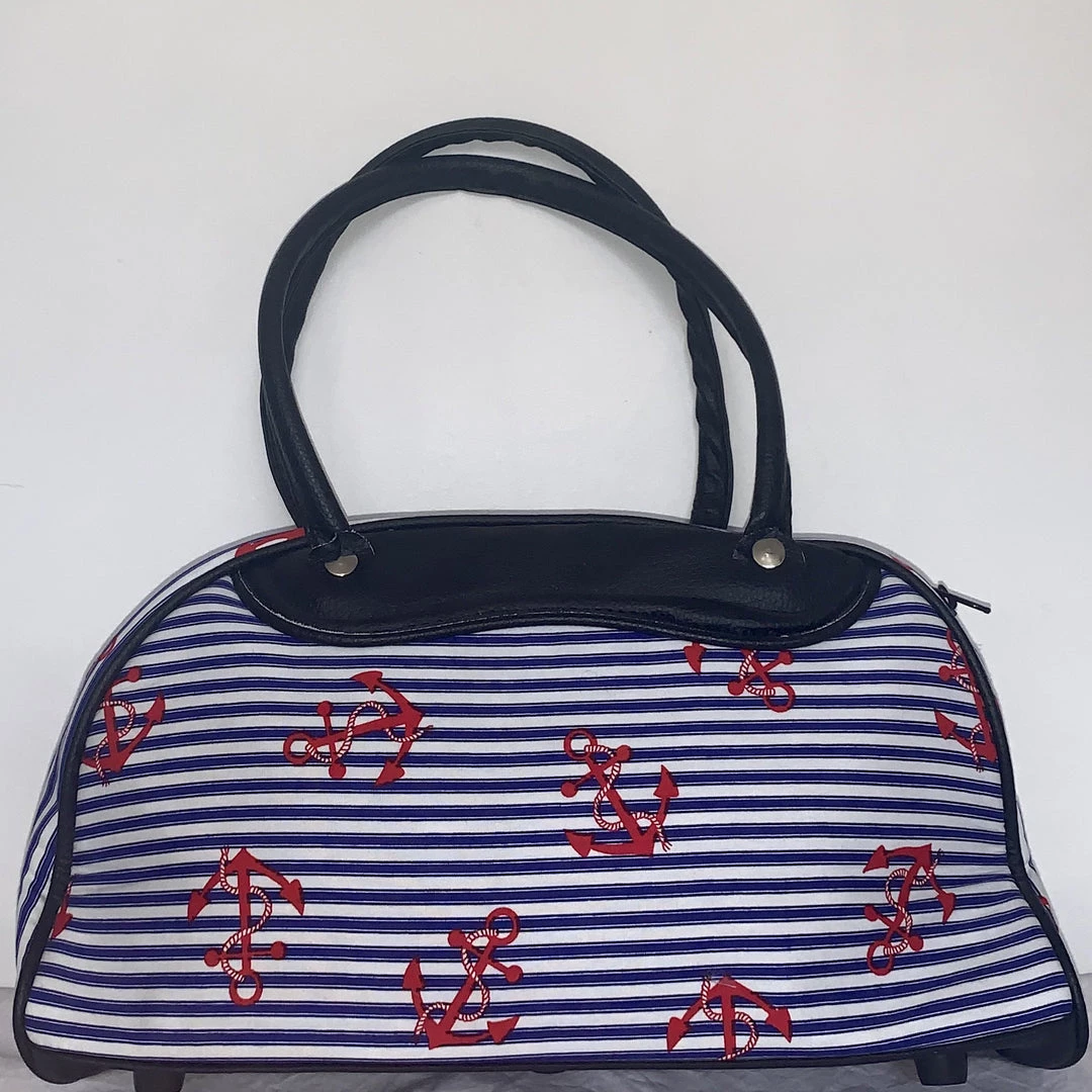Super cute retro style handbag with blue and white stripe and red anchor print