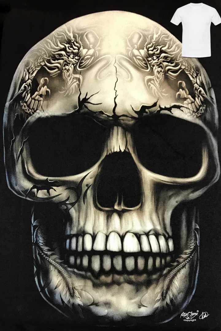 This bold men’s T-shirt features a detail skill print that glows in the dark! Print on both sides of the shirt.