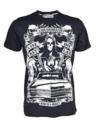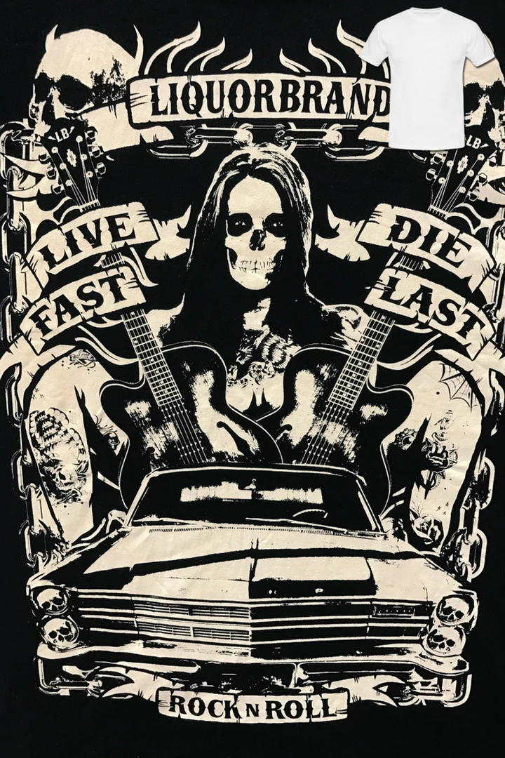 Black men’s tee from Liquorbrand featuring a skeleton lady, a car, two guitars and the words ‘Live Fast, Die Last’.