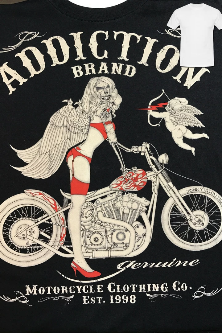 100% Cotton black men’s T-shirt from Addiciton featuring a skeleton lady riding a motorbike.