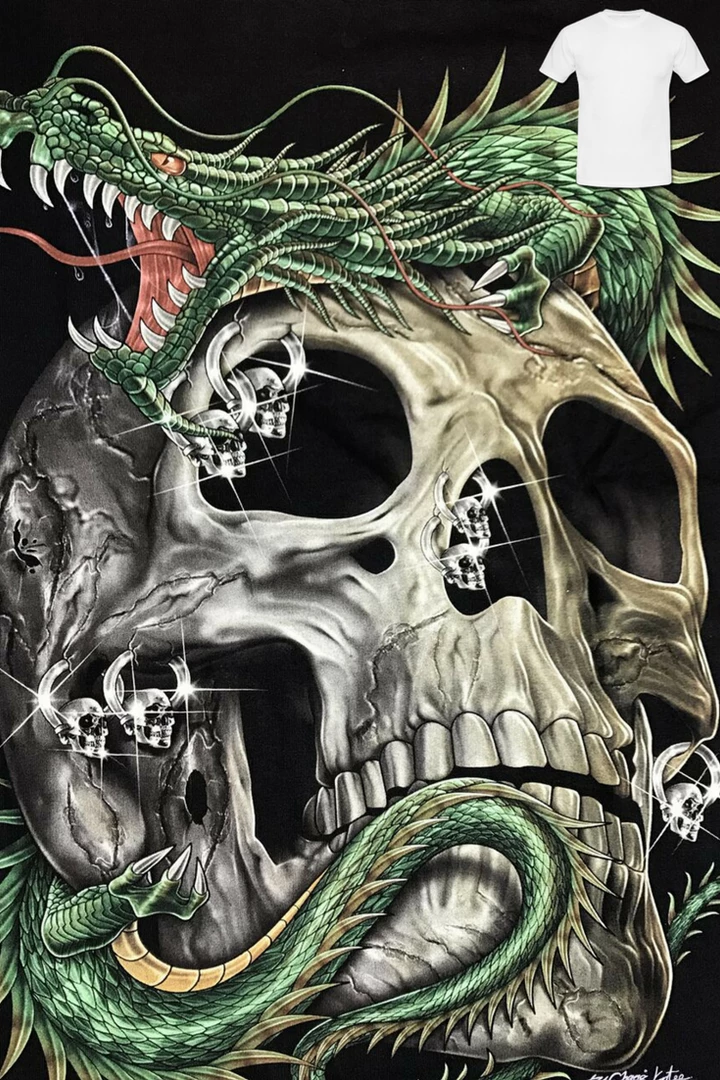 This men’s tee features an awesome and bright print of a skull and green dragon that glows in the dark!