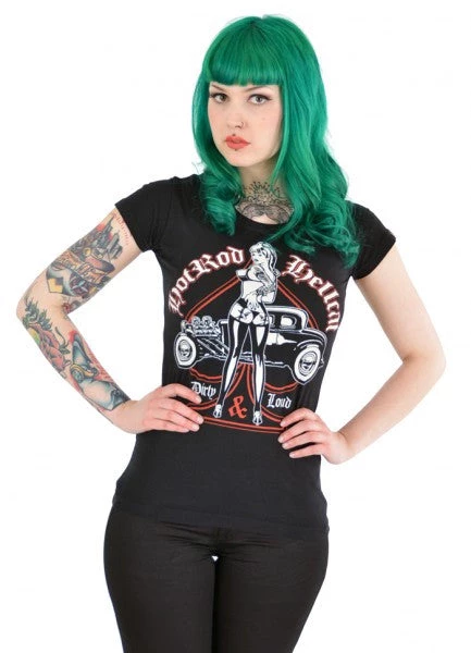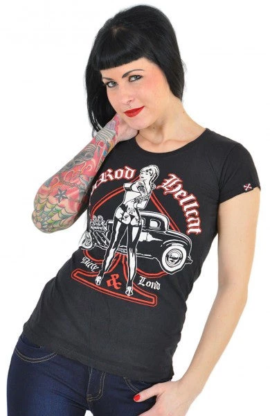 Show your love for cars and beautiful tattooed women in this awesome fitted tee from Hellrod and Hell Cat.
