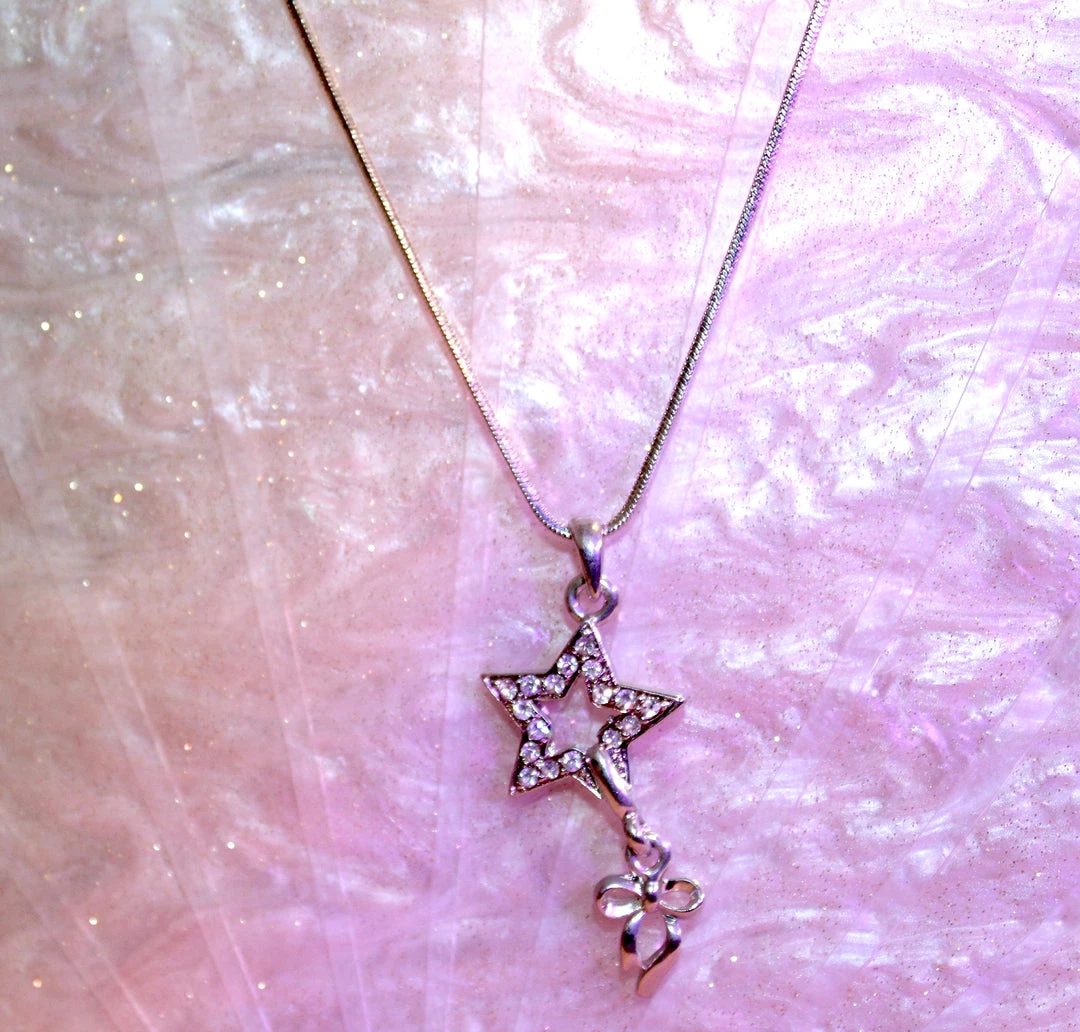 Super cute necklace with star shaped silver pendant and diamonte detailing, and tiny bow pendant.