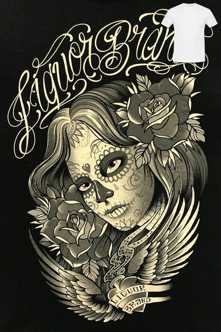 Black men’s tee from Liquorbrand featuring a beautiful lady with classic sugar skull painted on.