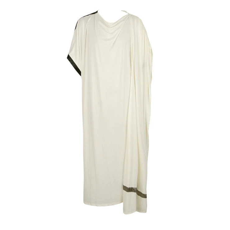 Long off white toga style costume with black trim and matching attached sash