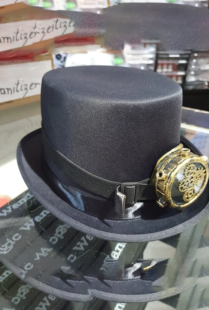 This black steampunk hat comes with a single goggle with bronze clockwork embellishments. Pair this with any of our steampunk corsets or a jacket to make a unforgettable outfit!
