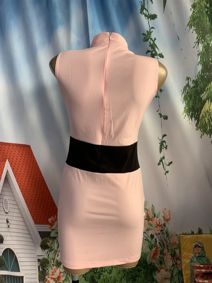 Tight stretchy pink sleeveless dress with black waist band and zip closure at the back. Pair with some white pantyhose and a long auburn wig for the ultimate 90’s/2000’s costume.