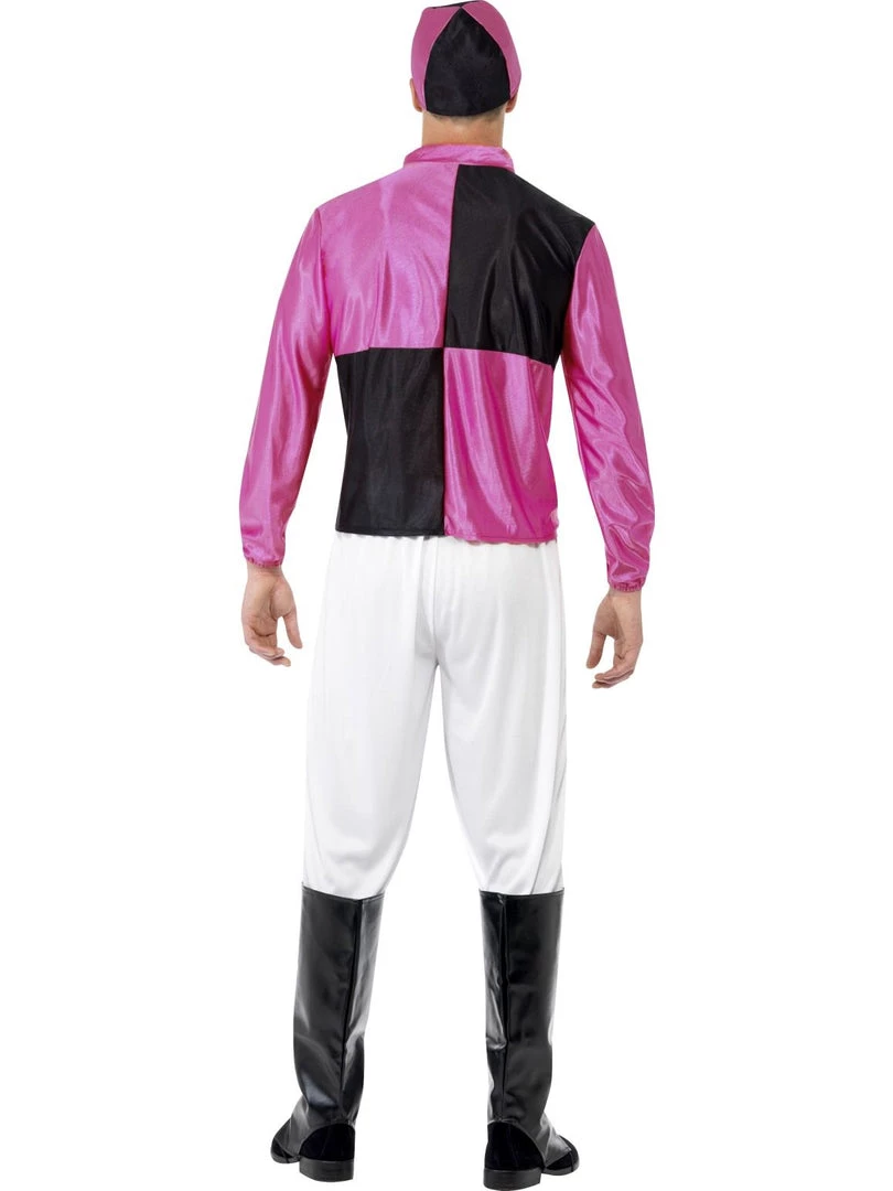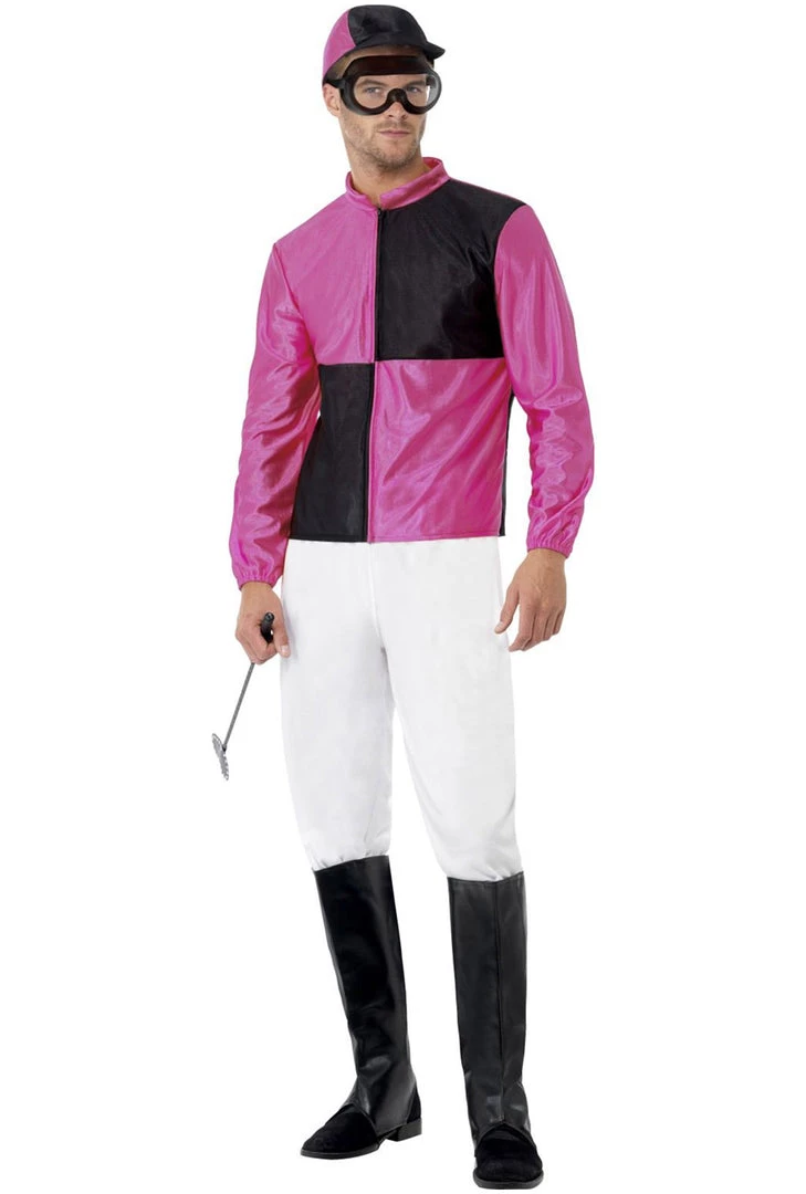 Ride the winner in our Pink Jockey Costume which includes a black and pink long-sleeved top and a matching Jockey Cap. Also included is a pair of 3/4 length White trousers with elastic around the waist and the legs so they tuck into the boot covers. Completing the look of the costume is a pair of Black Boot covers and black goggles.