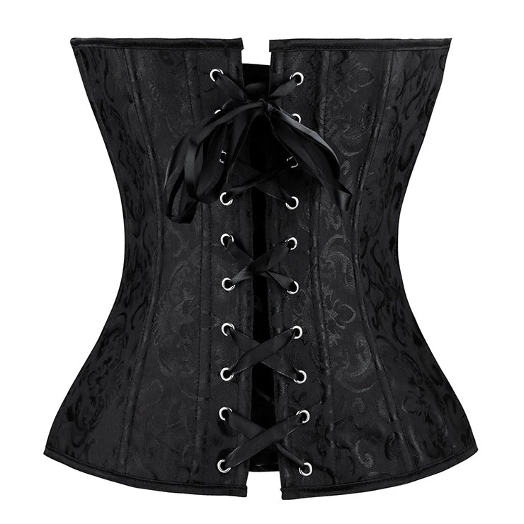 Plain black overbust corset with subtle jacquard print, classic lace up back for the perfect fit.