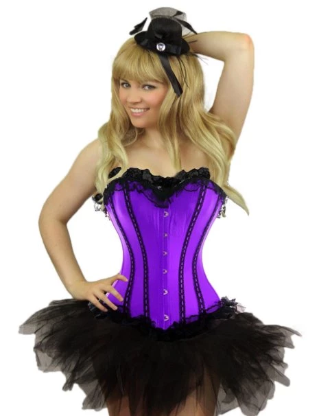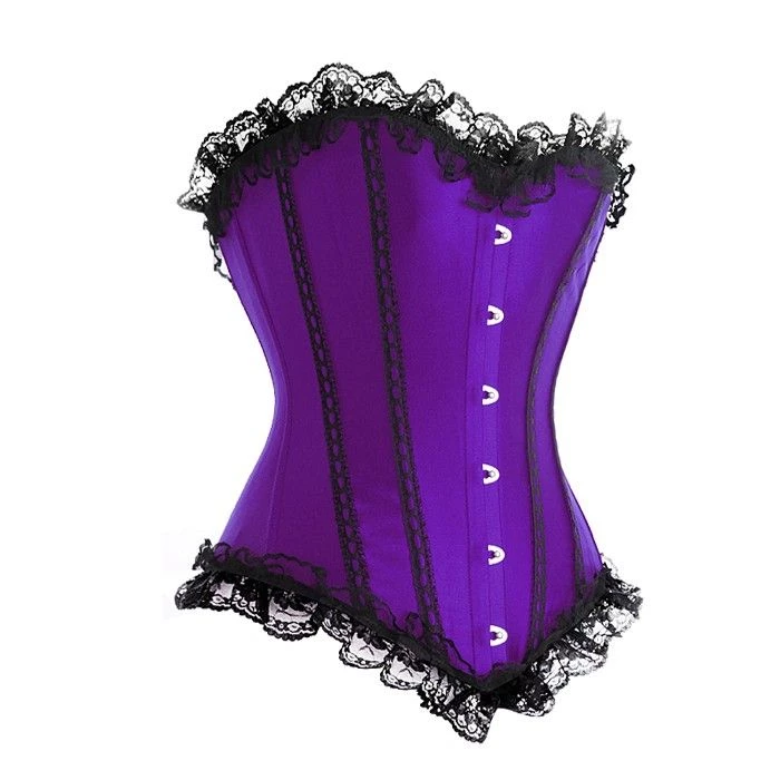 Beautiful bright purple satin corset with black trim featuring laceup back and busk closure.