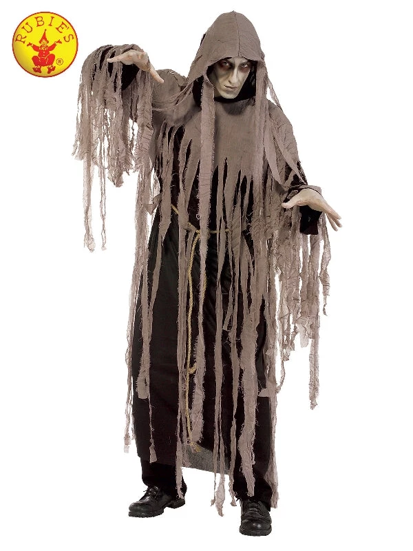- Full length black hooded gauze robe with attached fabric pieces on arms, hood and collar