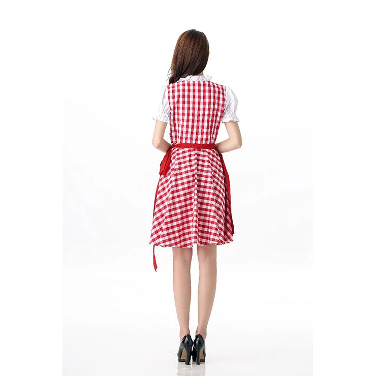 This knee length red checked dress features an A-frame silhouette with white fully sleeves and separate apron that ties at the waist.