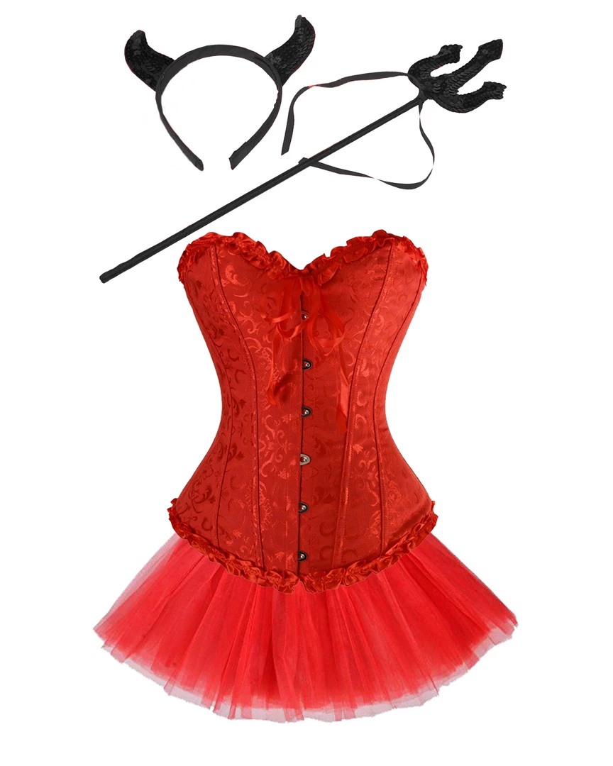 Includes our best selling red classic overbust corset with sheer red tulle tutu and sequinned devil horn headband and matching pitchfork.