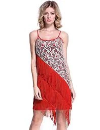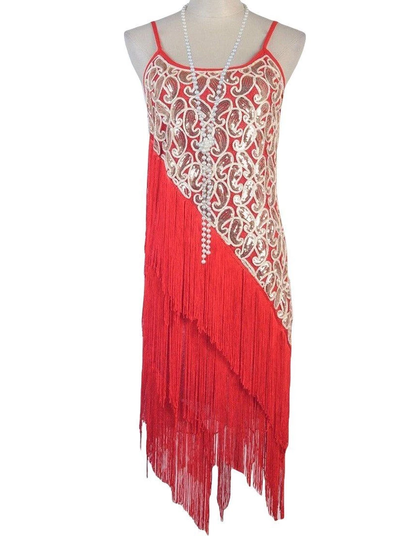 This stunning red dress is ideal for a night out on the town! Featured gold sequin paisley detailing on a diagonal, with fringing on the other half.