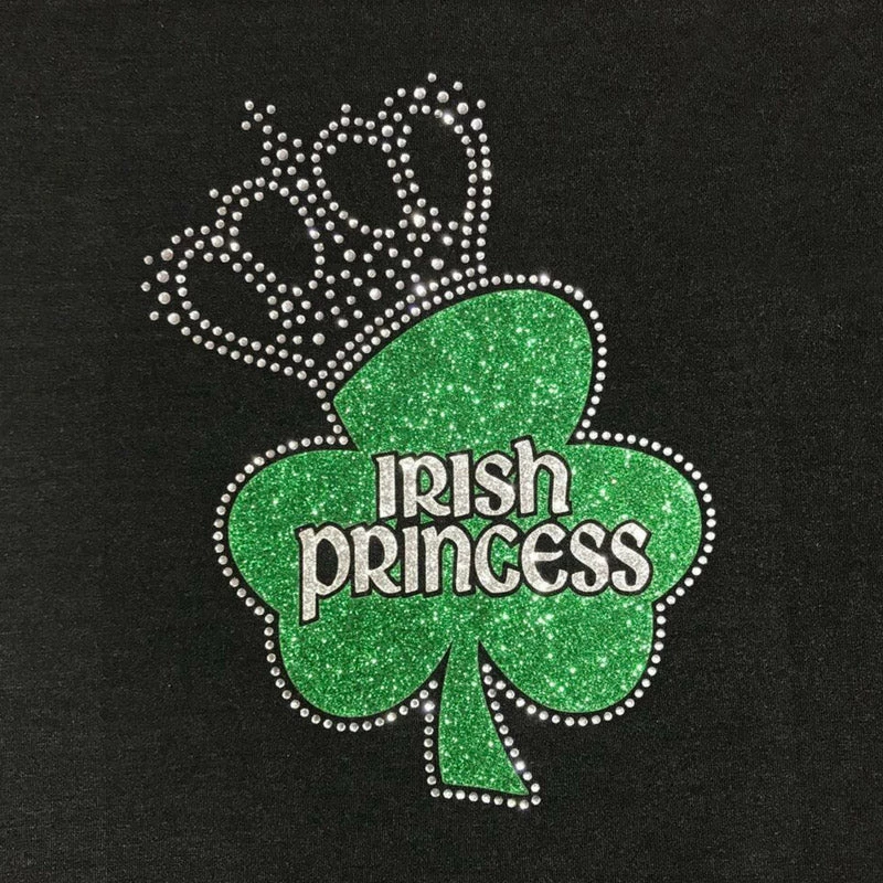 Glittery shamrock with a diamante crown and the words Irish Princess printed on a black singler