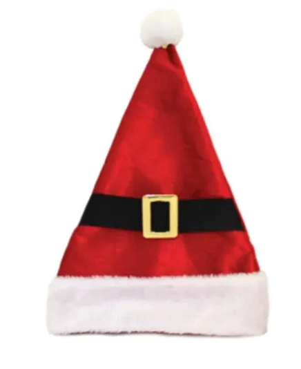 Red velvet hat with white fur trim and a santa buckle belt in the middle of the hat. Fits most.