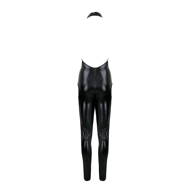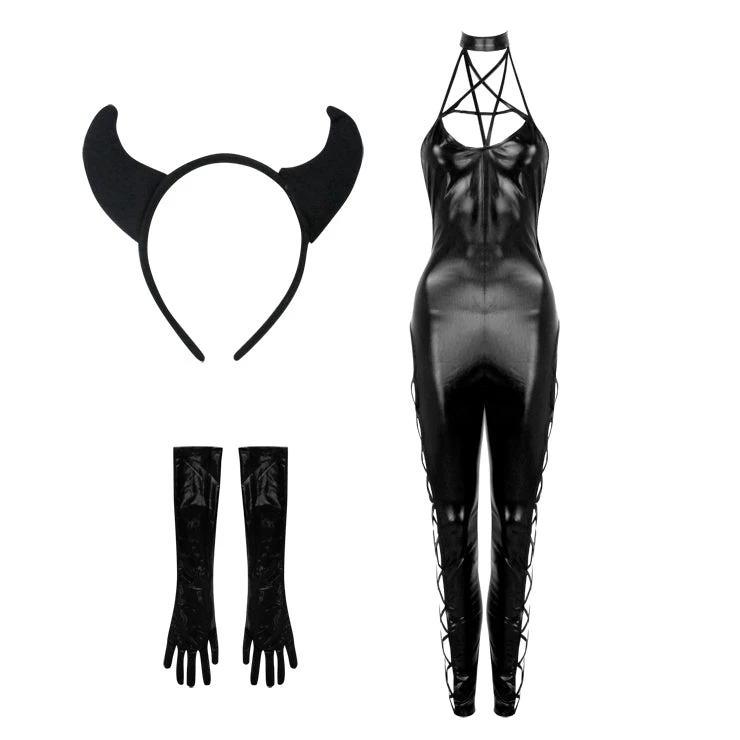 Sexy Black Devil Costume includes a Super Hot Wet-Look Black Catsuit With Pentagram Strap Details on the chest and Cut-Out Lace Up Side Details, Black Wet-Look Long Gloves and a Black Devil Horns Headband. Super hot for a spooky night out on Halloween!