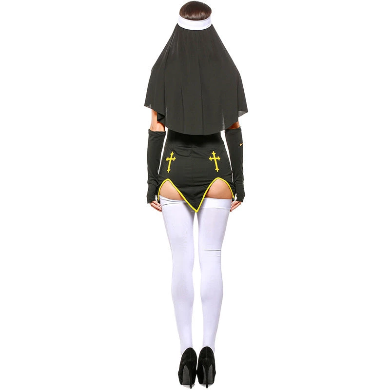 Sexy female nun costume. Perfect for Halloween. Costume includes a Headband with Black Cloth Back, A Black, White, and Gold Dress with Cut Out top and Cross details and Black Gauntlet Gloves with Gold Crosses.