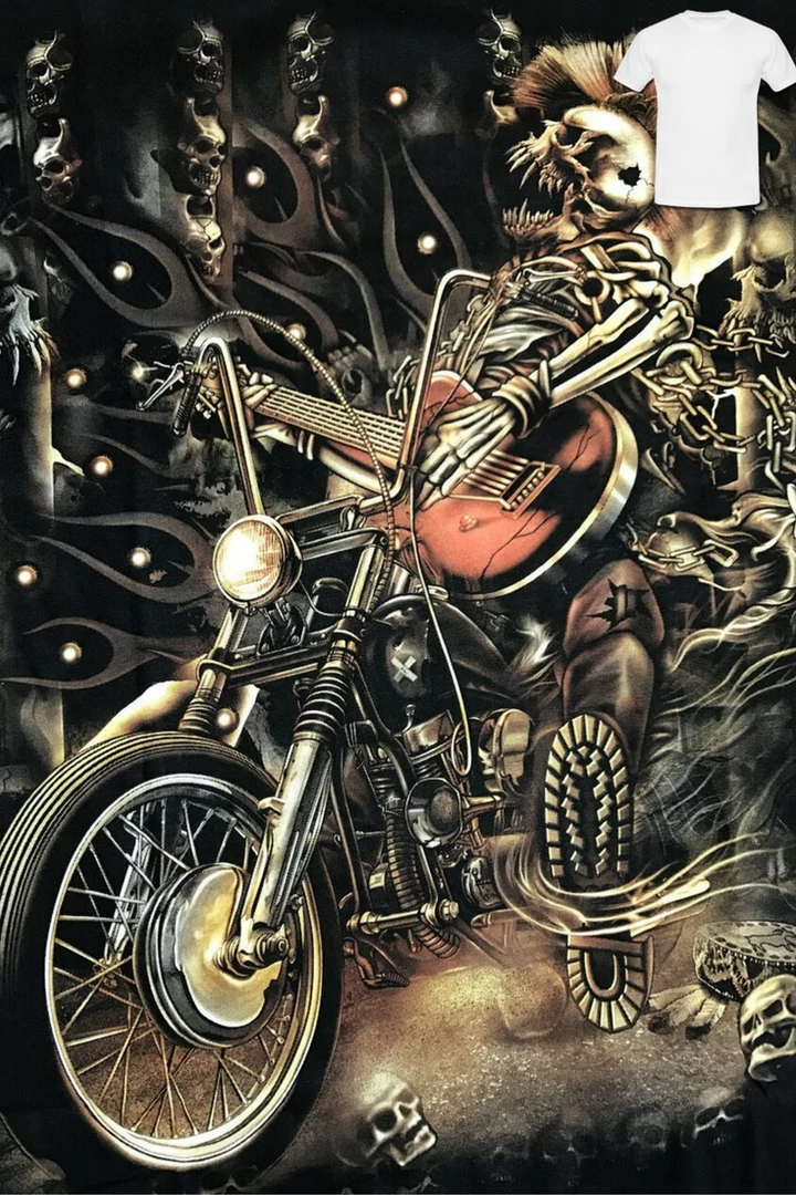 This bold printed men’s T-Shirt features a punk skeleton on a motorbike. Print on both sides of the shirt and it glows in the dark!