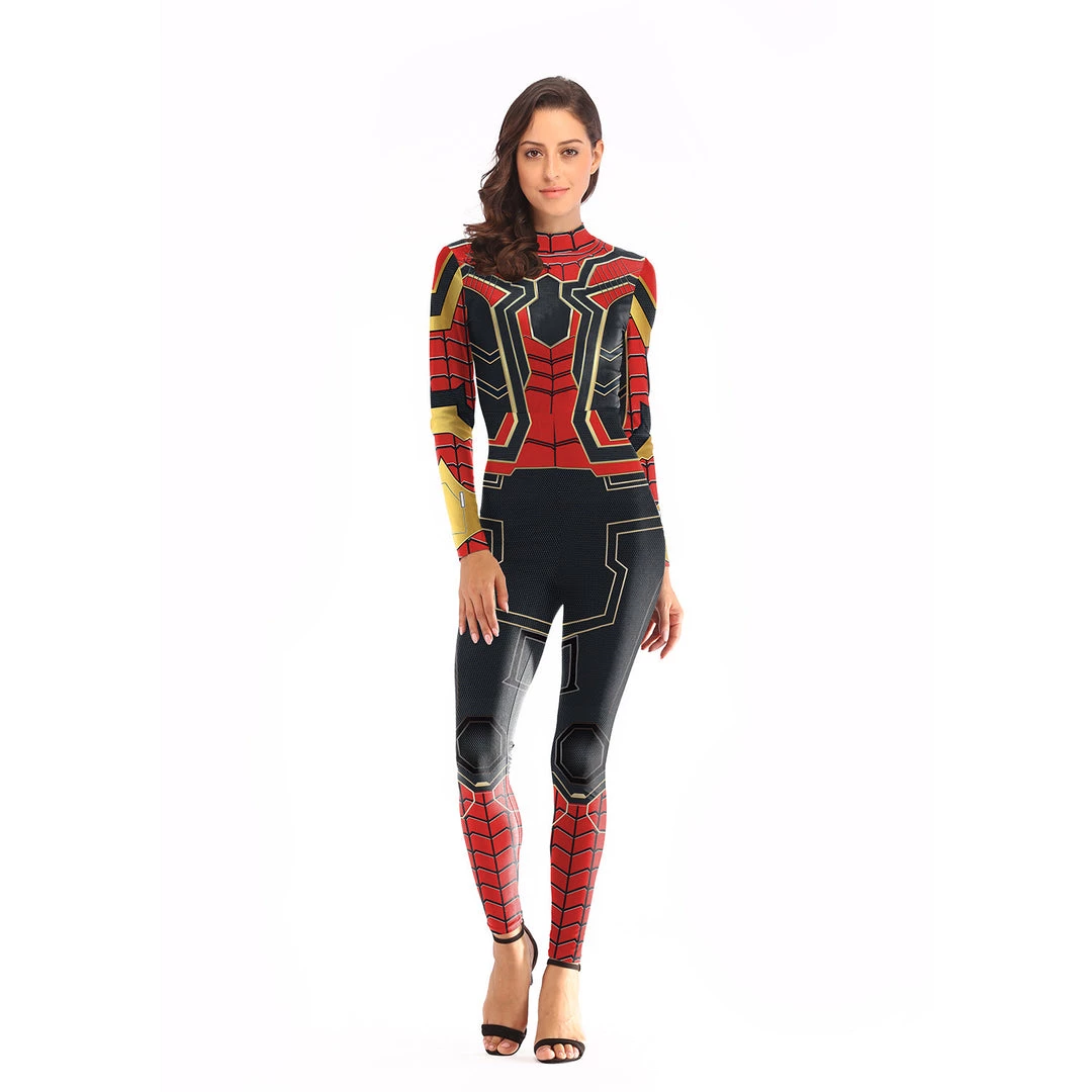 Tight bodysuit with all over Iron Spiderman print. Zip closure at the back.