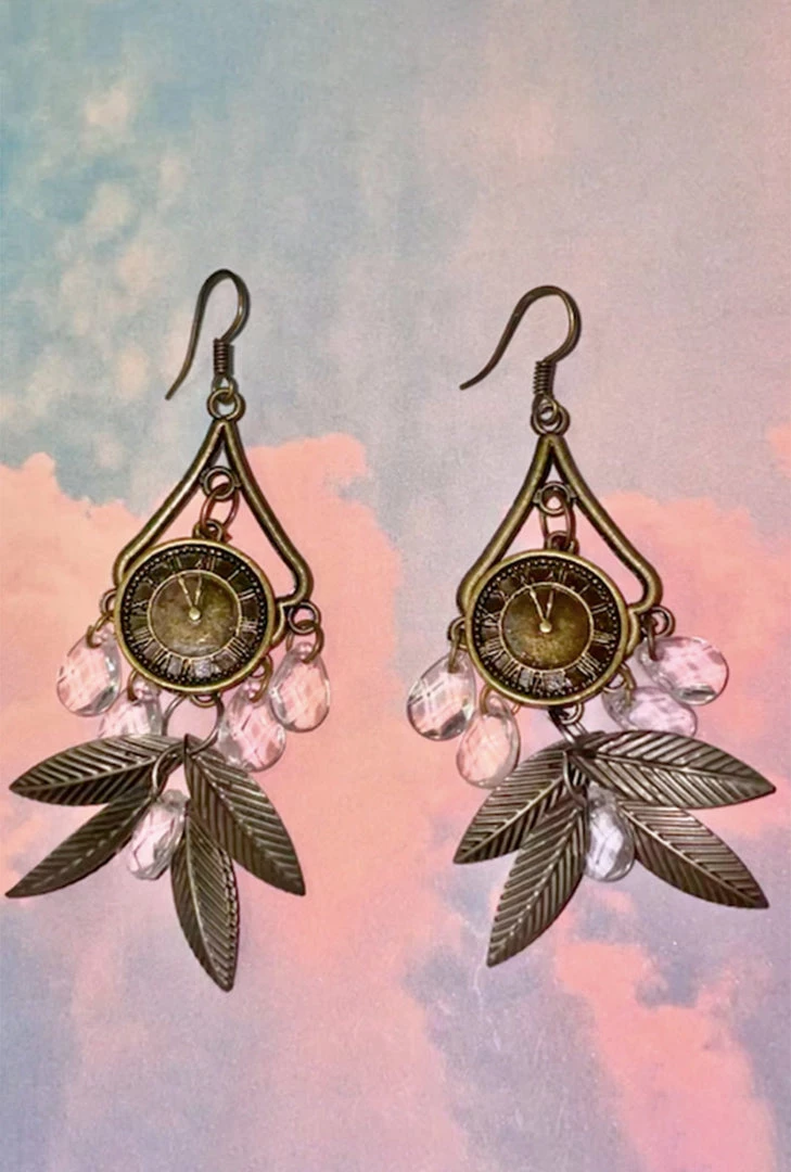 dangling earrings with clocks, feathers and crystals in a brass finish.