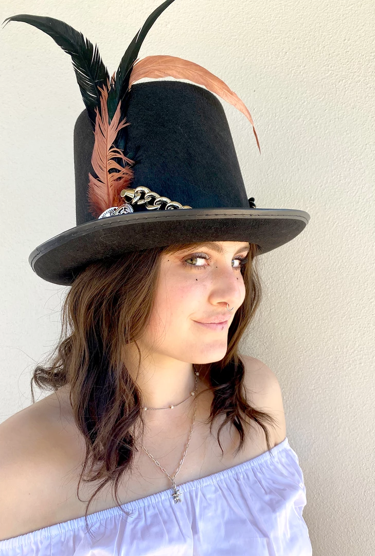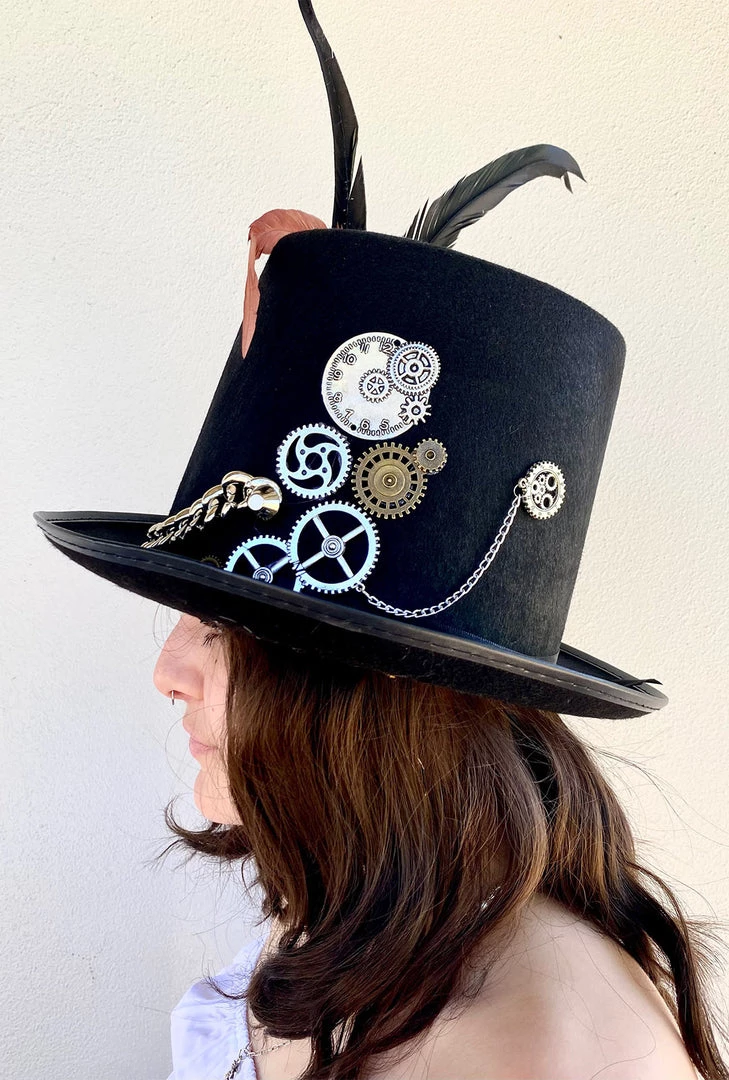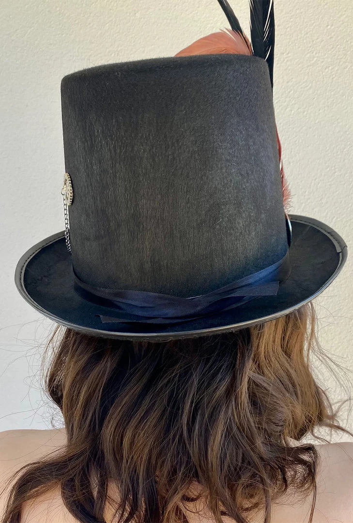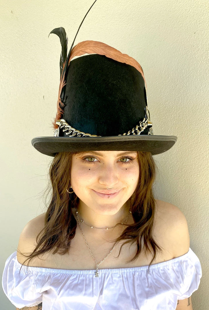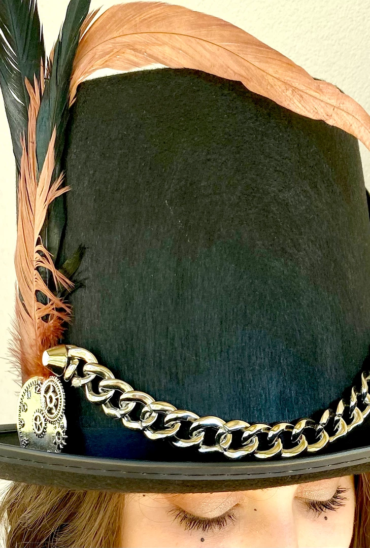 The Tall Black Top Hat has many Steampunk Details! includes long Black and Brown Feathers with multiple Silver and Bronze Cog details on the sides of the hat and a Chunky Silver Chain on the front.