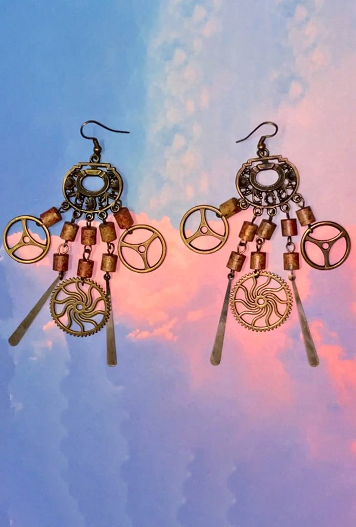 Dramatic dangling earrings with cogs and metal details in a classic brass finish.