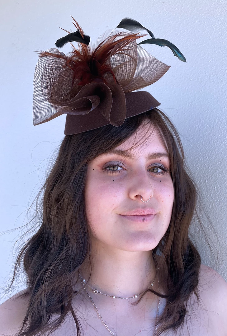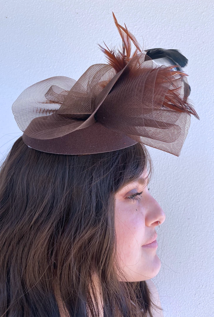 Handmade brown clip on fascinator decorated with brown tulle and brown feathers.