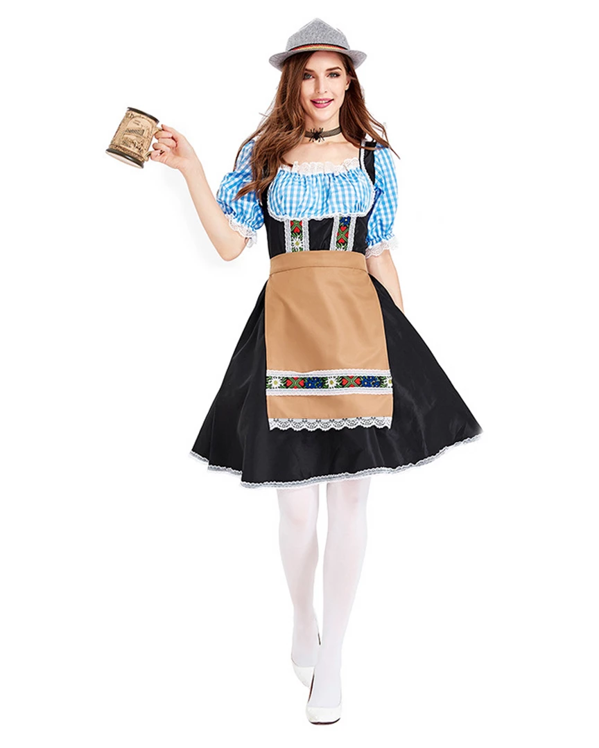 The Traditional Bavarian Maid Oktoberfest Dress includes a Knee-Length Dress with a Gingham Blue Print Top and Puffy Sleeves, an Underbust Black Bodice with Lace and Embroidery Details and a Full Black Skirt. It also includes a Light Brown Apron with Lace and Embroidery Details.