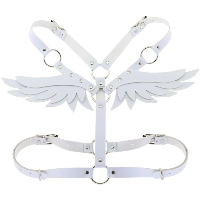 PU leather body harness with criss-cross front straps and back wings.
