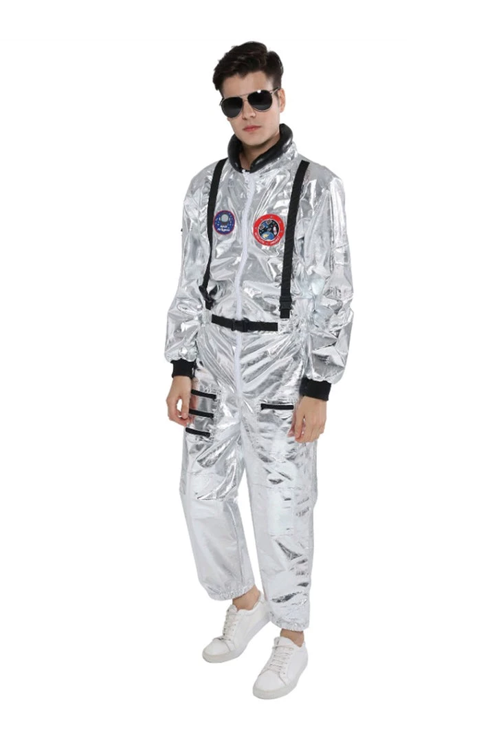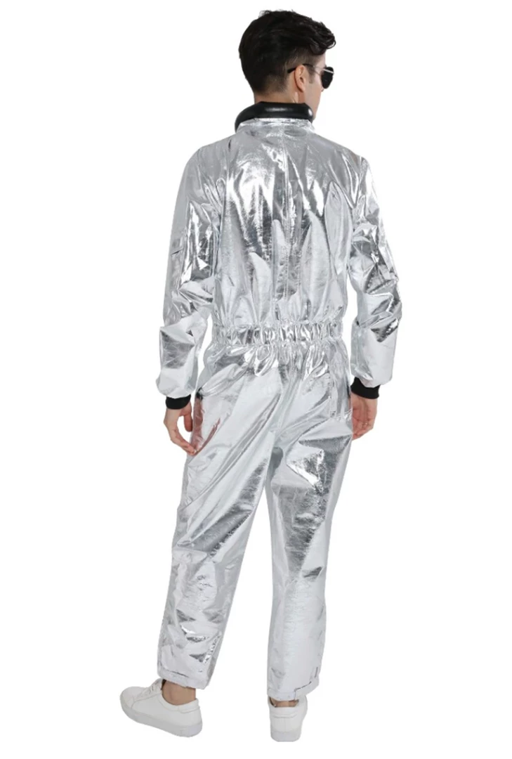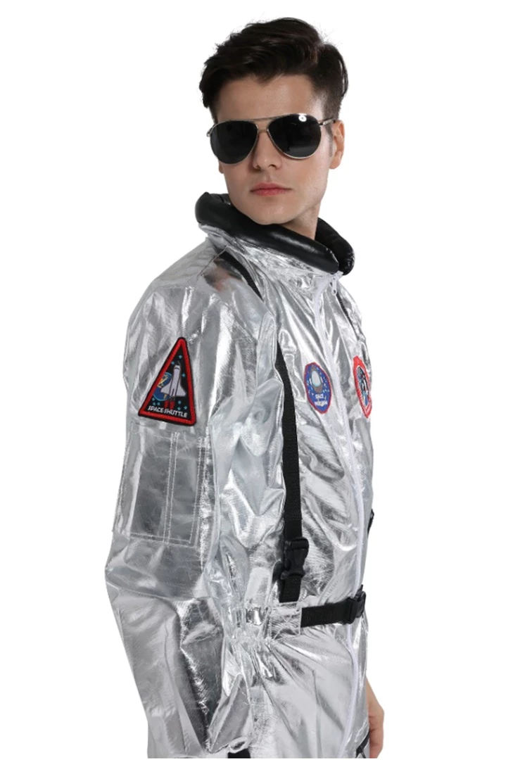 Jump into space in our Metallic Silver Astronaut costume! Includes a Silver Jumpsuit with Space and Satellite Patches on the chest! Mens size XL