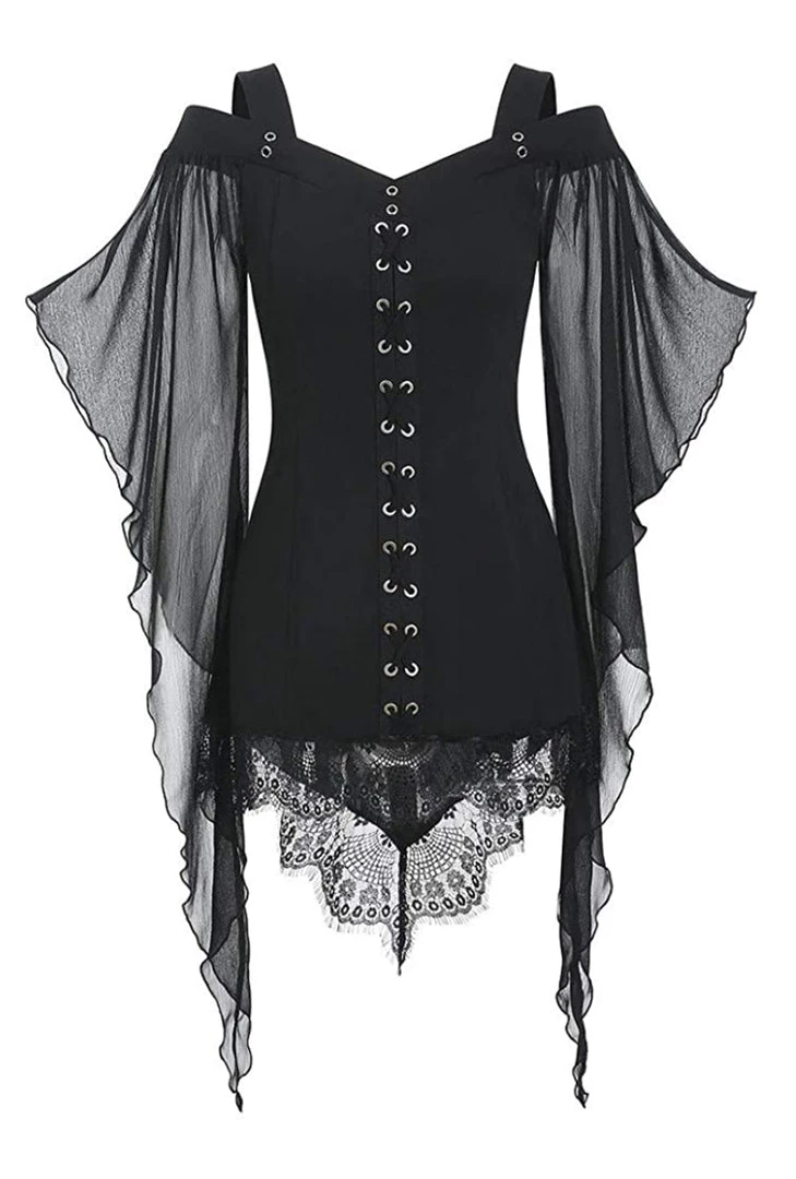 The Black Gothic Butterfly Sleeve Top features a middle lace-up detail with Black Straps and an off the shoulder opaque butterfly sleeve and lace trim. The back of the top had a V-shaped dip.