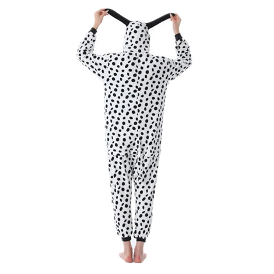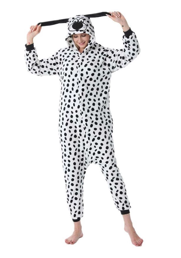This Dalmatian onesie has white with black coloured spots, Long Black ears and a cute Dalmatian face features on the hood.