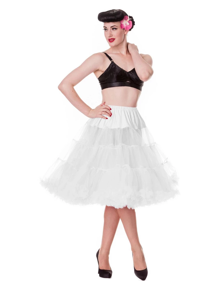 Achieve that classic 50’s look with this stunning three tier petticoat! Gives volume to all knee length dresses perfect for pin up fashion. The soft, high quality tulle won’t scratch your bare legs or make you itchy.