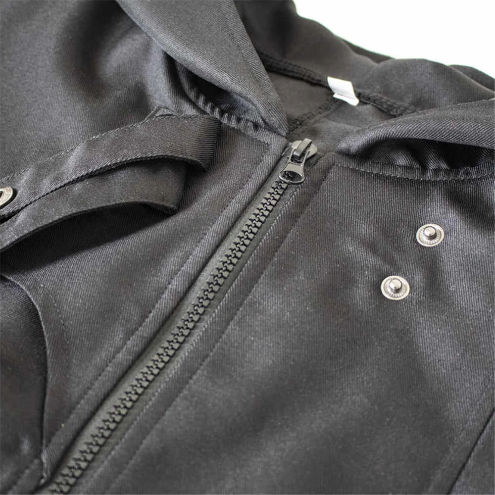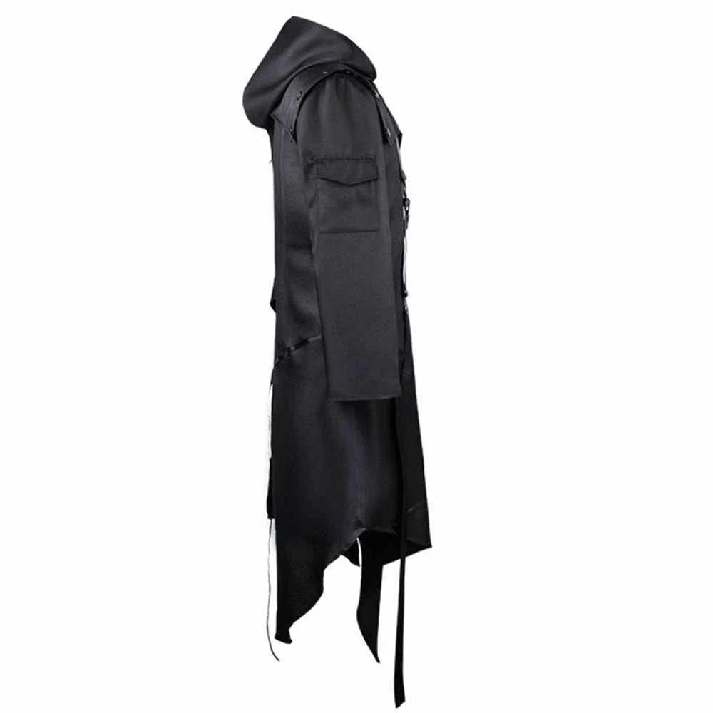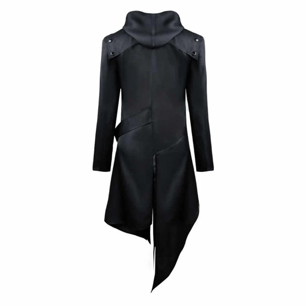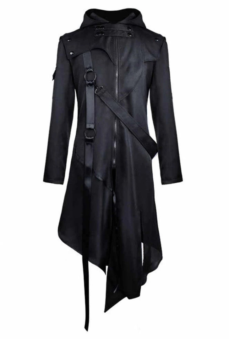 This deluxe jacket features an asymmetrical hem, zip front, strap details, and buttons on the shoulders. Perfect for gothic fashion, cosplays, medieval costumes or a steampunk outfit.