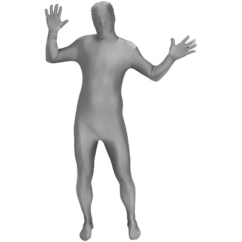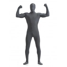 Grey morphsuit with zip closure, attached head, hands and feet.
